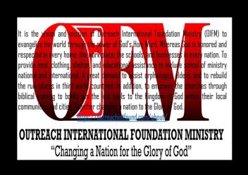 It is the vision and mission of Outreach International Foundation Ministry (OIFM) to evangelize the world through the power of God’s Holy Word. Whereas God is honored and respected in every home; the work place; the schools, the government, businesses, and corporations in every nation. To provide food, clothing, shelter, and educational assistance to include school of ministry national and international. A great demand to assist those that are in need around the world. In addition, to empower the